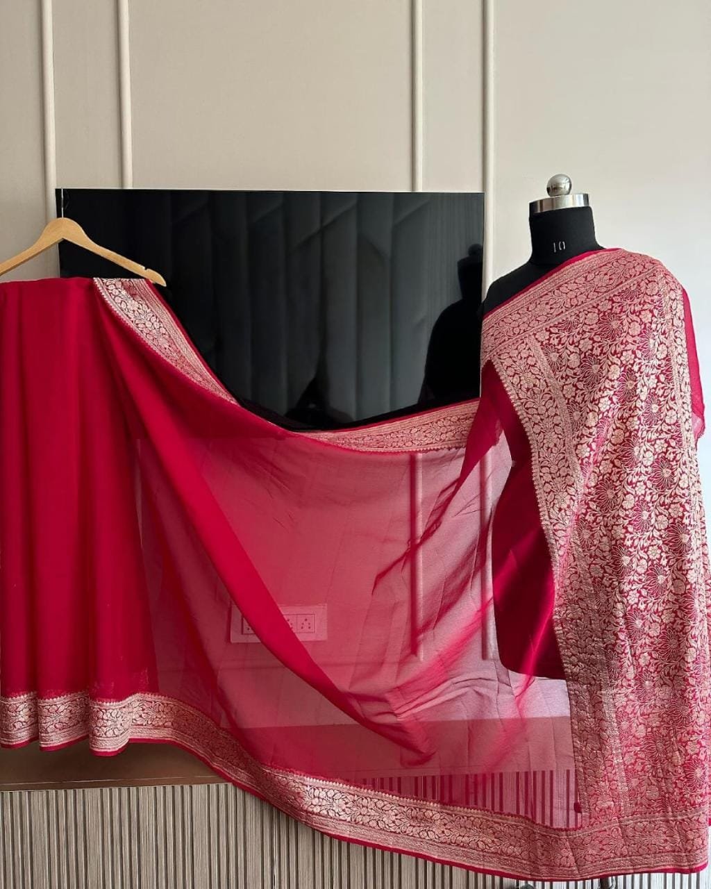 Fabric :                Banarasi mysore crape silk (dyeable saree)